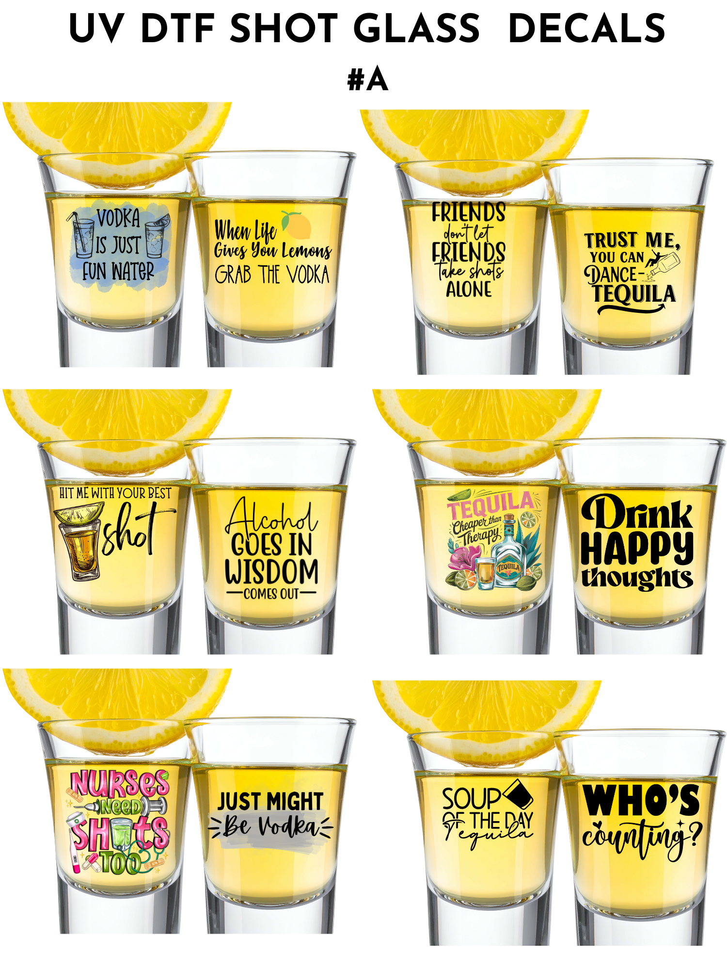BUNDLE #A- 12 decals -Shot glasses or keychain